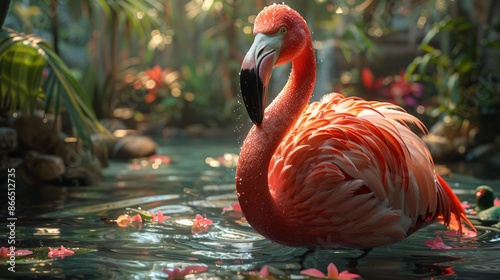 Fototapeta premium Detailed view of a flamingo in a lagoon, capturing its vibrant plumage and...