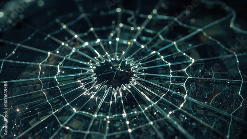 © CryptoCanvas, Fototapeta premium Detailed view of a shattered car window with colorful light dispersion.