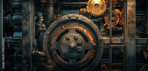 Fototapeta premium Detailed view of a system of gears and cogs set in a vintage machine, highlighting the intricate workings and aged metal textures, evoking a sense of historical engineering.