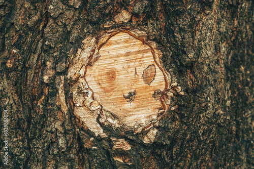 Fototapeta premium Detailed view of a tree trunk showing an exposed wood patch where bark was...