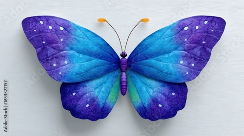 Fototapeta premium Detailed view of a vibrant blue and purple butterfly with white spots on textured white background