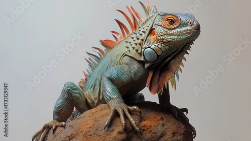 Obraz premium Detailed view of a vibrant iguana perched on a textured rock surface