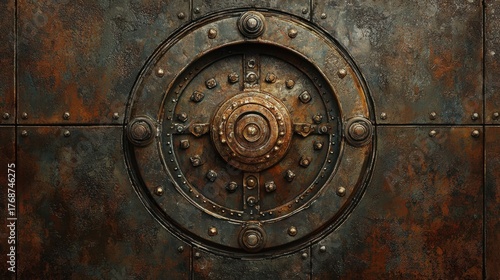 Fototapeta premium Detailed view of a vintage rusty vault door showcasing intricate metalwork...
