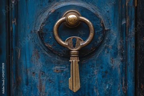 Fototapeta premium Detailed view of an antique key hanging from a round door knocker on a weathered blue wooden door
