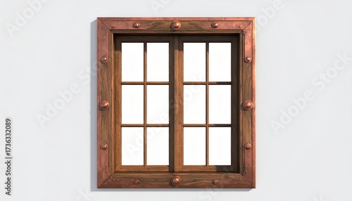 © Bakeke, Fototapeta premium Detailed view of an ornate, antique wooden window with a copper frame, showing a grid of six panes, centered on a white wall, displaying texture, and the interplay of light and shadow, capturing a...