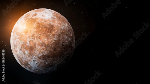 © Somporn Na Ubon, Fototapeta premium detailed view of celestial body, showcasing its textured surface and craters against dark background, with soft glow illuminating one side