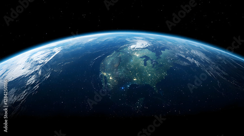© Hyndk, Obraz premium Detailed View of Earth from Space Showing Blue Atmosphere and Illuminated City Lights Against Black Background