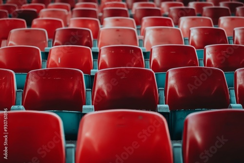 Naklejka premium Detailed view of empty red plastic stadium chairs arranged in symmetrical...