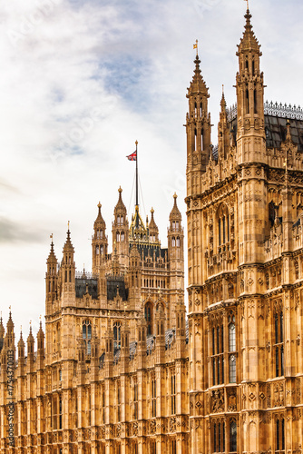 Fototapeta premium Detailed view of ornate Gothic architecture of the Palace of Westminster in London