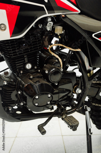 © bo.kvk, Obraz premium Detailed view of the motorcycle engine with chrome exhaust pipe.