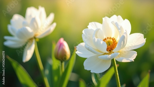 © NeuralNiche, Fototapeta premium Detailed view of white peony blossoms in a garden setting.