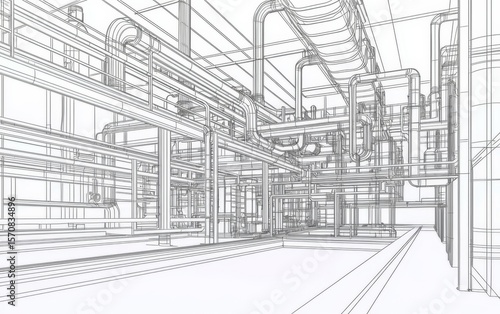 © Thunyarat, Fototapeta premium Detailed visualization of manufacturing facility pipelines under natural light.