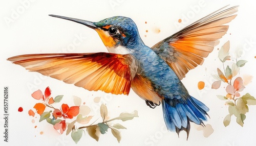 Obraz premium Detailed watercolor hummingbird in flight, vibrant colors