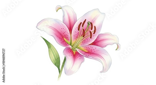 © Hungarian, Naklejka premium Detailed watercolor illustration depicts a vibrant pink spotted stamen flower against a clean white background