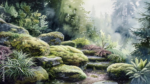 Obraz premium Detailed watercolor of a shade garden, moss-covered rocks, ferns, soft...
