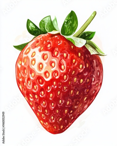 © Matija, Obraz premium Detailed watercolor-style digital illustration of a ripe red strawberry with vibrant seeds and green leaves