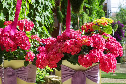 Fototapeta premium Details and elements of the street interior, many flowers and greenery