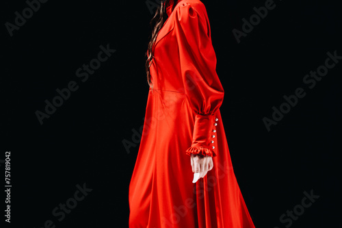 Fototapeta premium Details of a bright red long dress. Women's elegant fashion