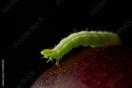 © DiazAragon, Naklejka premium Details of a green caterpillar on a plum
