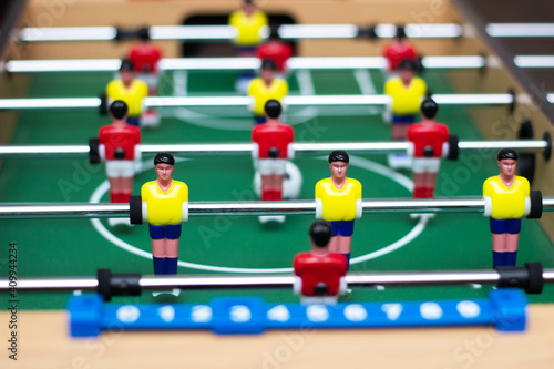 Fototapeta premium Details of a table soccer game. Table football is a toy for children. Close up. Selective focus