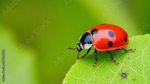 Fototapeta premium Details of a vibrant red ladybug crawling on a green leaf, garden, red