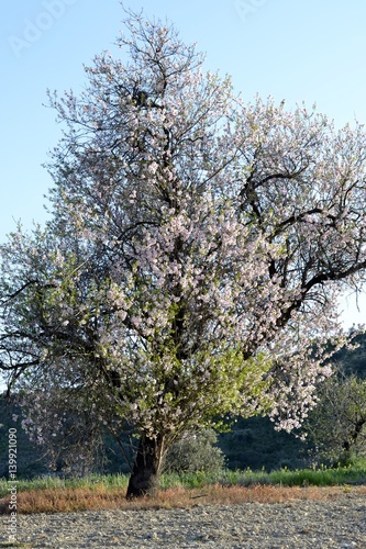 Fototapeta premium Details of almond tree flowers and green leaves