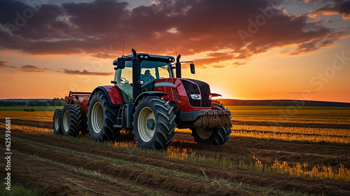 © Nataliia, Fototapeta premium Details of farmer working in the fields with tractor on a sunset background. Agriculture industry details Generative AI