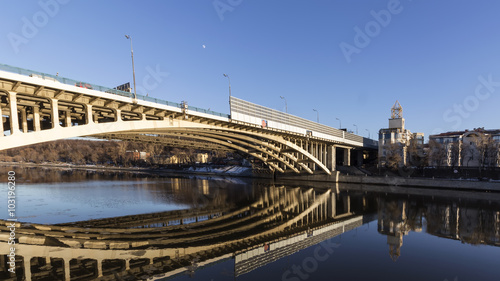 Naklejka premium Details of steel bridge and reflection in water of moscow river