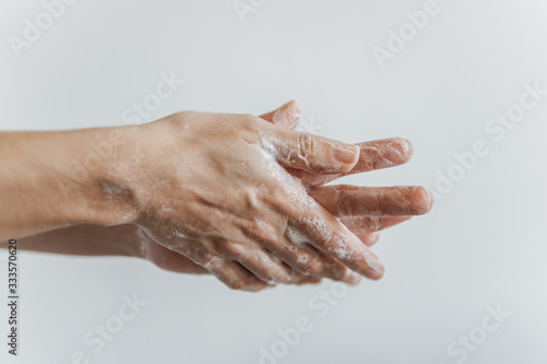 Fototapeta premium Detalhe de mãos femininas com espuma de sabonete. Lavar as mãos para combater o coronavírus.