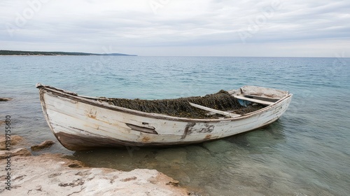 Fototapeta premium Deteriorating fishing boat partially sunken near the shore with seaweed...