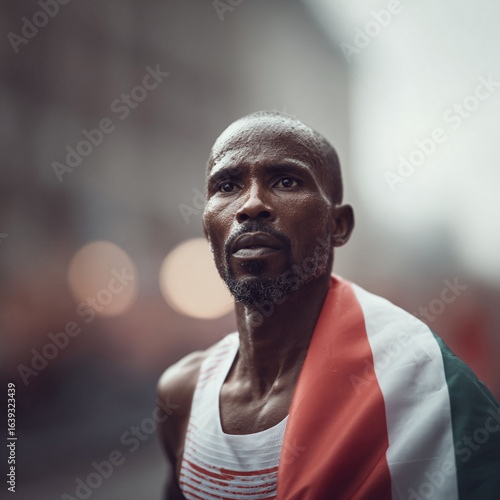 Fototapeta premium Determined athlete draped in a flag, symbolizing achievement and national...