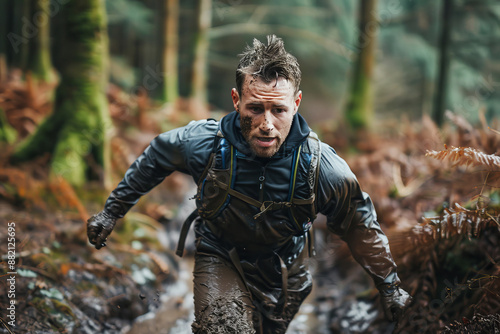 Obraz premium Determined male athlete is pushing through a muddy trail run in the forest