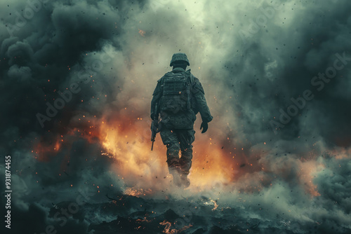 © Golib Tolibov, Fototapeta premium Determined soldier wades through battlefield smoke