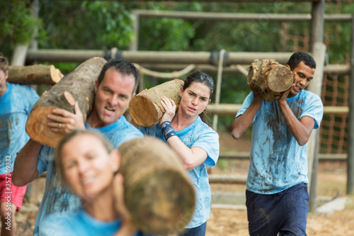 Fototapeta premium Determined team carrying logs on boot camp race course