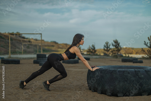 Fototapeta premium determined woman in athletic wear pushes a large tire in a training area...