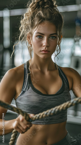 © Maestro, Fototapeta premium Determined Woman Working Out with Battle Ropes in Gym