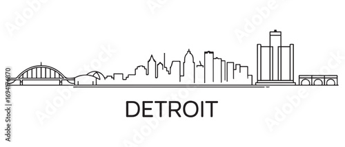 © Nargis, Obraz premium Detroit City Line Art skyline horizontal banner. Detroit City, Michigan. Vector template for your design. with white background