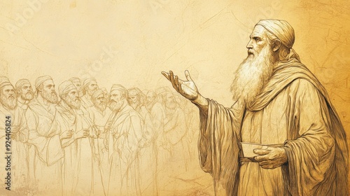Fototapeta premium Deuteronomy's Tithing Law: Moses teaching importance of supporting Levites and needy. Biblical illustration with beige background for Bible wall art.
