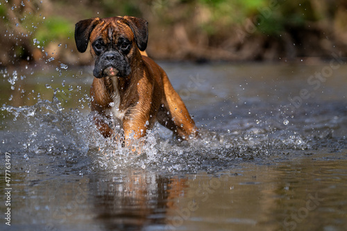 Obraz premium deutscher Boxer Urmel geht durch einen Bachlauf