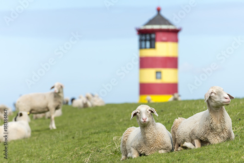 © Oskar, Obraz premium Deutschland, Niedersachsen, Ostfriesland, Krummhörn, Schafe beim Pilsumer Leuchtturm.