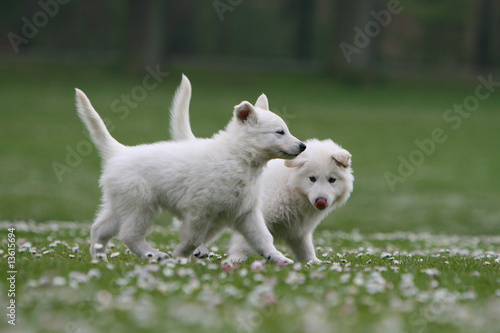 © Dogs, Fototapeta premium deux chiots bergers blancs à la campagne
