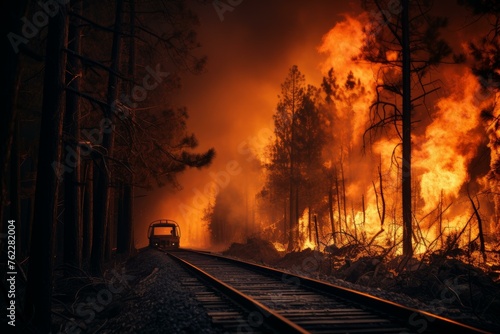 © juliars, Naklejka premium Devastating Railway fire forest natural. Scenic death. Generate Ai