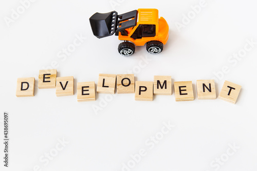 Fototapeta premium Development of the word written on a wooden block, development of the lettering, small toy tractor. The concept of line, renovation, development.