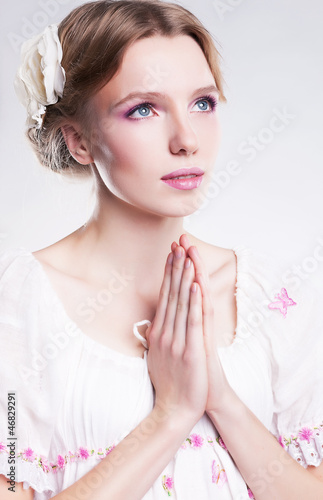 © gromovataya, Fototapeta premium Devotion. Faith. Young christian woman praying against her sin
