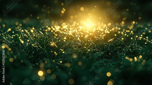 © Nuri_Studio, Naklejka premium Dew-covered grass illuminated by soft golden light