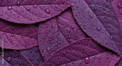 Fototapeta premium Dew covered purple leaves overlapping in a natural pattern with water droplets creating a textured botanical background