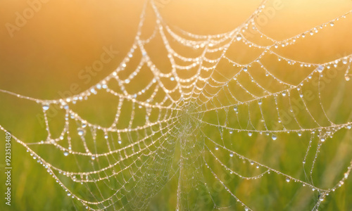 © Miklos, Naklejka premium Dew-Covered Spider Web Glimmering in Sunrise Light Over Green Grass