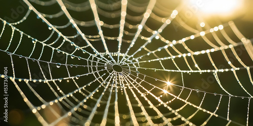 Obraz premium Dew-Covered Spider Web Glistening in Sunlight