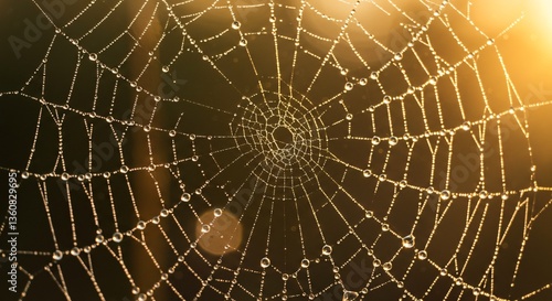 Obraz premium Dew-Covered Spider Web in Golden Light