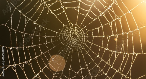 Obraz premium Dew-Covered Spider Web in Golden Light
